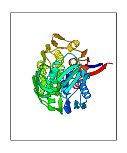 These views are prepared from three orthologuous viewpoints with MolScript. Secondary structures are determined from the C-alpha atom positions of your protein (N-terminal blue, C-terminal red).
