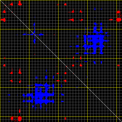 This matrix displays the maximum distance fluctuations between all pairs of CA atoms and between the two extreme conformations that were computed for this mode (DQMIN/DQMAX). Distance increases are plotted in blue and decreases in red for the strongest 10% of the residue pair distance changes. Every pixel corresponds to a single residue. Grey lines are drawn every 10 residues, yellow lines every 100 residues (counting from the upper left corner).