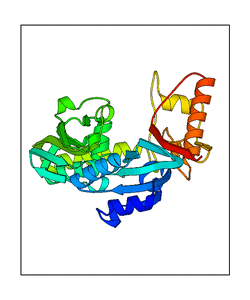 These views are prepared from three orthologuous viewpoints with MolScript. Secondary structures are determined from the C-alpha atom positions of your protein (N-terminal blue, C-terminal red).