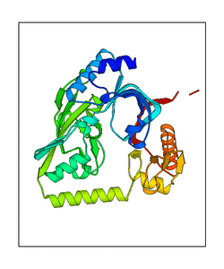 These views are prepared from three orthologuous viewpoints with MolScript. Secondary structures are determined from the C-alpha atom positions of your protein (N-terminal blue, C-terminal red).