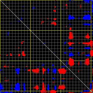 This matrix displays the maximum distance fluctuations between all pairs of CA atoms and between the two extreme conformations that were computed for this mode (DQMIN/DQMAX). Distance increases are plotted in blue and decreases in red for the strongest 10% of the residue pair distance changes. Every pixel corresponds to a single residue. Grey lines are drawn every 10 residues, yellow lines every 100 residues (counting from the upper left corner).