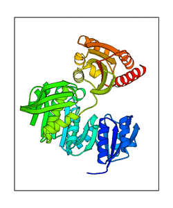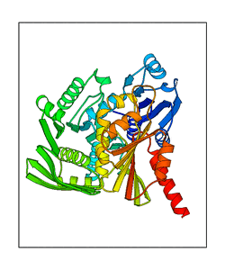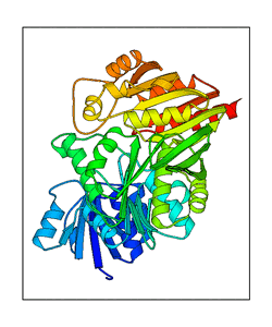 These views are prepared from three orthologuous viewpoints with MolScript. Secondary structures are determined from the C-alpha atom positions of your protein (N-terminal blue, C-terminal red).