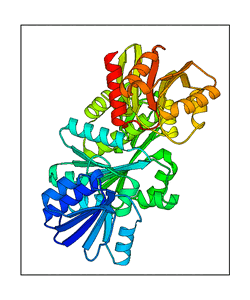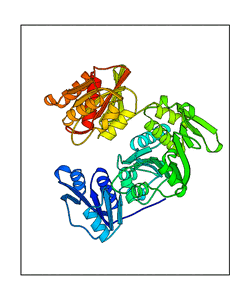These views are prepared from three orthologuous viewpoints with MolScript. Secondary structures are determined from the C-alpha atom positions of your protein (N-terminal blue, C-terminal red).