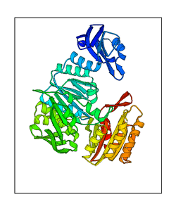 These views are prepared from three orthologuous viewpoints with MolScript. Secondary structures are determined from the C-alpha atom positions of your protein (N-terminal blue, C-terminal red).