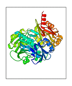 These views are prepared from three orthologuous viewpoints with MolScript. Secondary structures are determined from the C-alpha atom positions of your protein (N-terminal blue, C-terminal red).