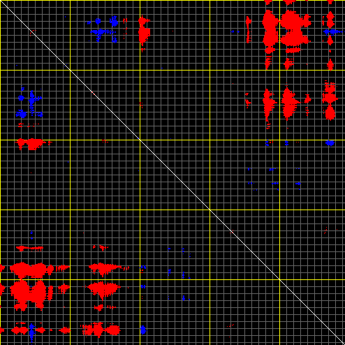 This matrix displays the maximum distance fluctuations between all pairs of CA atoms and between the two extreme conformations that were computed for this mode (DQMIN/DQMAX). Distance increases are plotted in blue and decreases in red for the strongest 10% of the residue pair distance changes. Every pixel corresponds to a single residue. Grey lines are drawn every 10 residues, yellow lines every 100 residues (counting from the upper left corner).