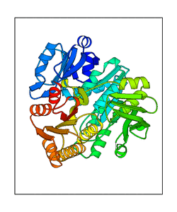 These views are prepared from three orthologuous viewpoints with MolScript. Secondary structures are determined from the C-alpha atom positions of your protein (N-terminal blue, C-terminal red).