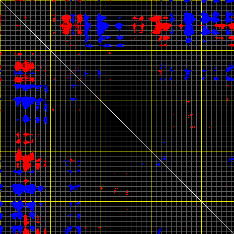 This matrix displays the maximum distance fluctuations between all pairs of CA atoms and between the two extreme conformations that were computed for this mode (DQMIN/DQMAX). Distance increases are plotted in blue and decreases in red for the strongest 10% of the residue pair distance changes. Every pixel corresponds to a single residue. Grey lines are drawn every 10 residues, yellow lines every 100 residues (counting from the upper left corner).