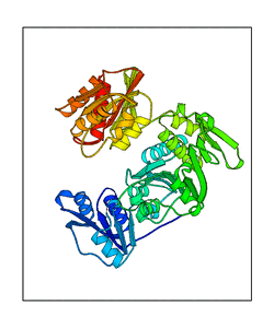 These views are prepared from three orthologuous viewpoints with MolScript. Secondary structures are determined from the C-alpha atom positions of your protein (N-terminal blue, C-terminal red).