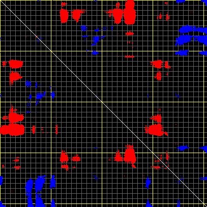 This matrix displays the maximum distance fluctuations between all pairs of CA atoms and between the two extreme conformations that were computed for this mode (DQMIN/DQMAX). Distance increases are plotted in blue and decreases in red for the strongest 10% of the residue pair distance changes. Every pixel corresponds to a single residue. Grey lines are drawn every 10 residues, yellow lines every 100 residues (counting from the upper left corner).