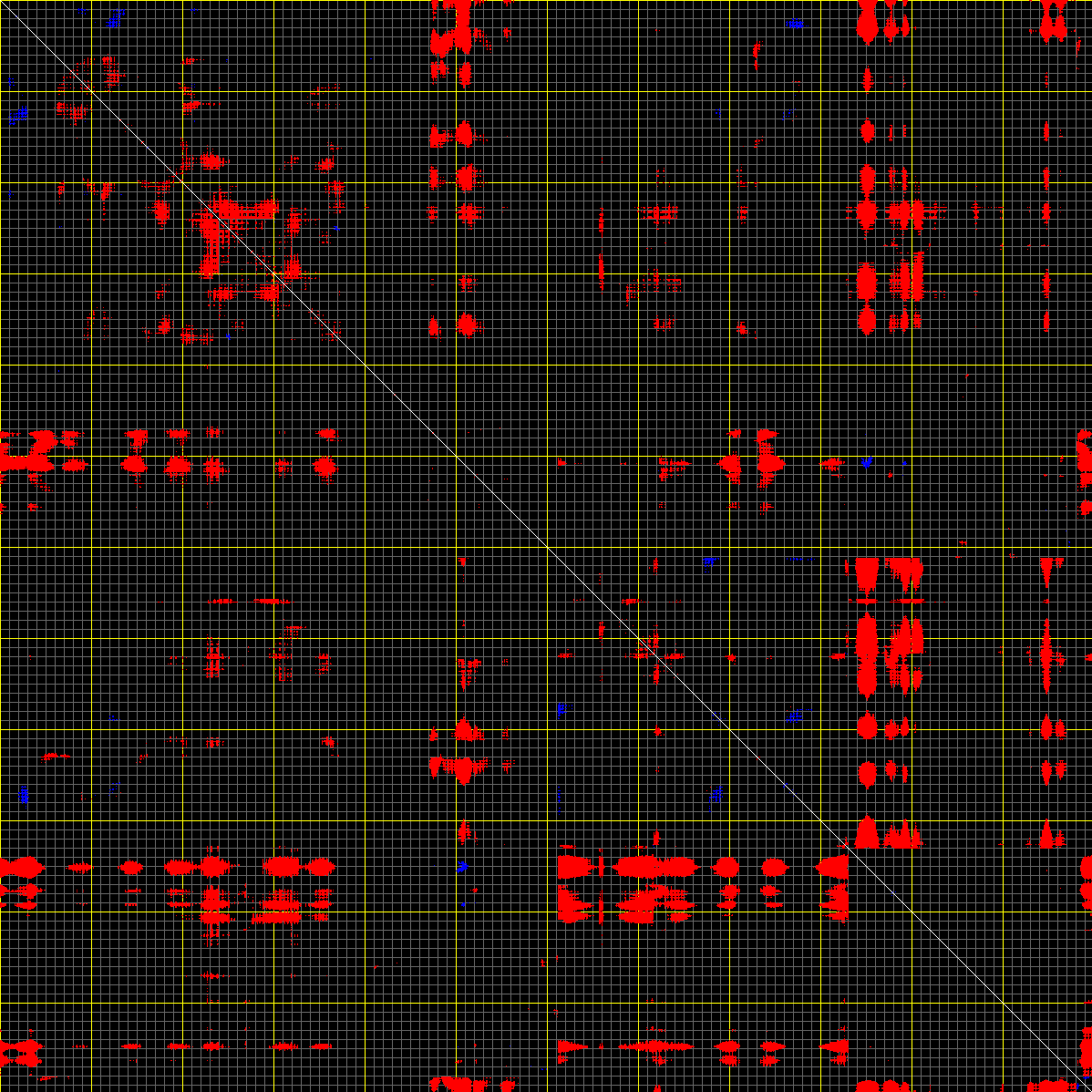 This matrix displays the maximum distance fluctuations between all pairs of CA atoms and between the two extreme conformations that were computed for this mode (DQMIN/DQMAX). Distance increases are plotted in blue and decreases in red for the strongest 10% of the residue pair distance changes. Every pixel corresponds to a single residue. Grey lines are drawn every 10 residues, yellow lines every 100 residues (counting from the upper left corner).