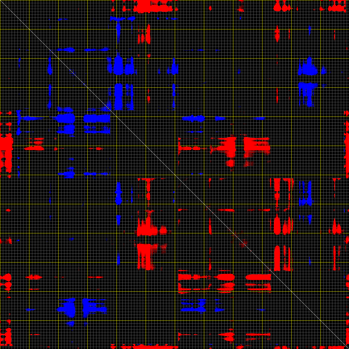 This matrix displays the maximum distance fluctuations between all pairs of CA atoms and between the two extreme conformations that were computed for this mode (DQMIN/DQMAX). Distance increases are plotted in blue and decreases in red for the strongest 10% of the residue pair distance changes. Every pixel corresponds to a single residue. Grey lines are drawn every 10 residues, yellow lines every 100 residues (counting from the upper left corner).