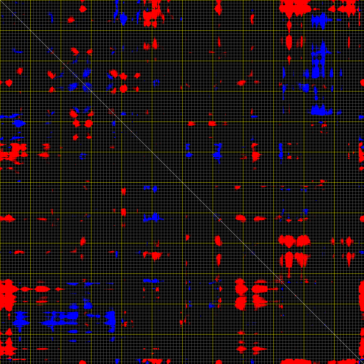 This matrix displays the maximum distance fluctuations between all pairs of CA atoms and between the two extreme conformations that were computed for this mode (DQMIN/DQMAX). Distance increases are plotted in blue and decreases in red for the strongest 10% of the residue pair distance changes. Every pixel corresponds to a single residue. Grey lines are drawn every 10 residues, yellow lines every 100 residues (counting from the upper left corner).