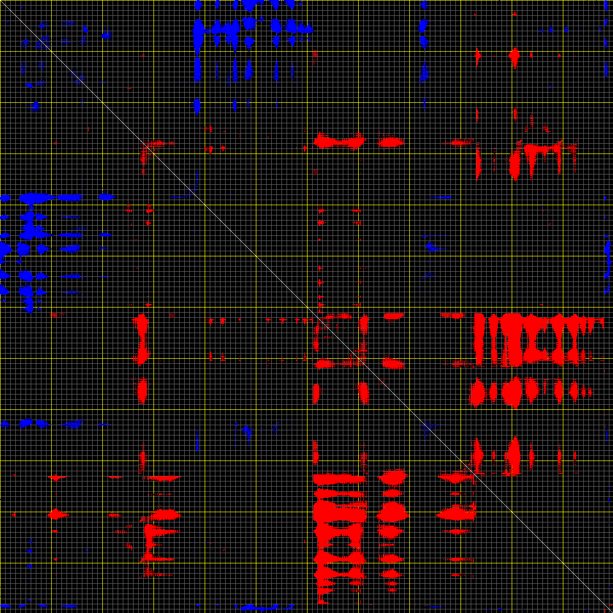 This matrix displays the maximum distance fluctuations between all pairs of CA atoms and between the two extreme conformations that were computed for this mode (DQMIN/DQMAX). Distance increases are plotted in blue and decreases in red for the strongest 10% of the residue pair distance changes. Every pixel corresponds to a single residue. Grey lines are drawn every 10 residues, yellow lines every 100 residues (counting from the upper left corner).