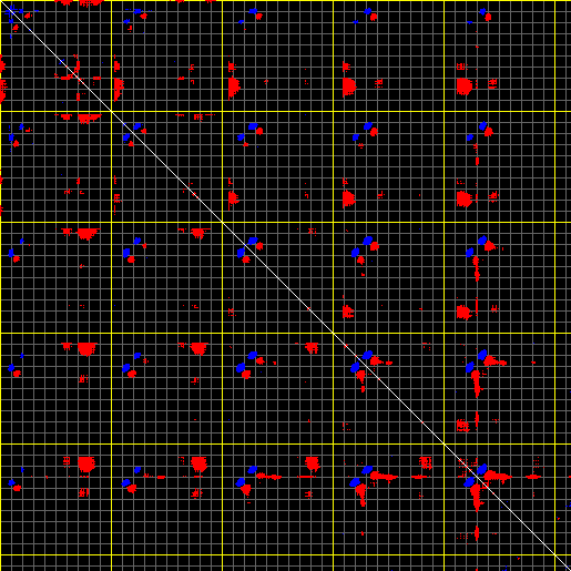 This matrix displays the maximum distance fluctuations between all pairs of CA atoms and between the two extreme conformations that were computed for this mode (DQMIN/DQMAX). Distance increases are plotted in blue and decreases in red for the strongest 10% of the residue pair distance changes. Every pixel corresponds to a single residue. Grey lines are drawn every 10 residues, yellow lines every 100 residues (counting from the upper left corner).