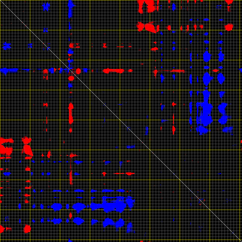 This matrix displays the maximum distance fluctuations between all pairs of CA atoms and between the two extreme conformations that were computed for this mode (DQMIN/DQMAX). Distance increases are plotted in blue and decreases in red for the strongest 10% of the residue pair distance changes. Every pixel corresponds to a single residue. Grey lines are drawn every 10 residues, yellow lines every 100 residues (counting from the upper left corner).