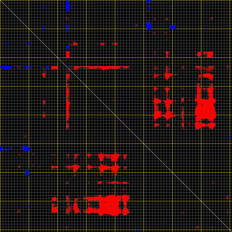 This matrix displays the maximum distance fluctuations between all pairs of CA atoms and between the two extreme conformations that were computed for this mode (DQMIN/DQMAX). Distance increases are plotted in blue and decreases in red for the strongest 10% of the residue pair distance changes. Every pixel corresponds to a single residue. Grey lines are drawn every 10 residues, yellow lines every 100 residues (counting from the upper left corner).