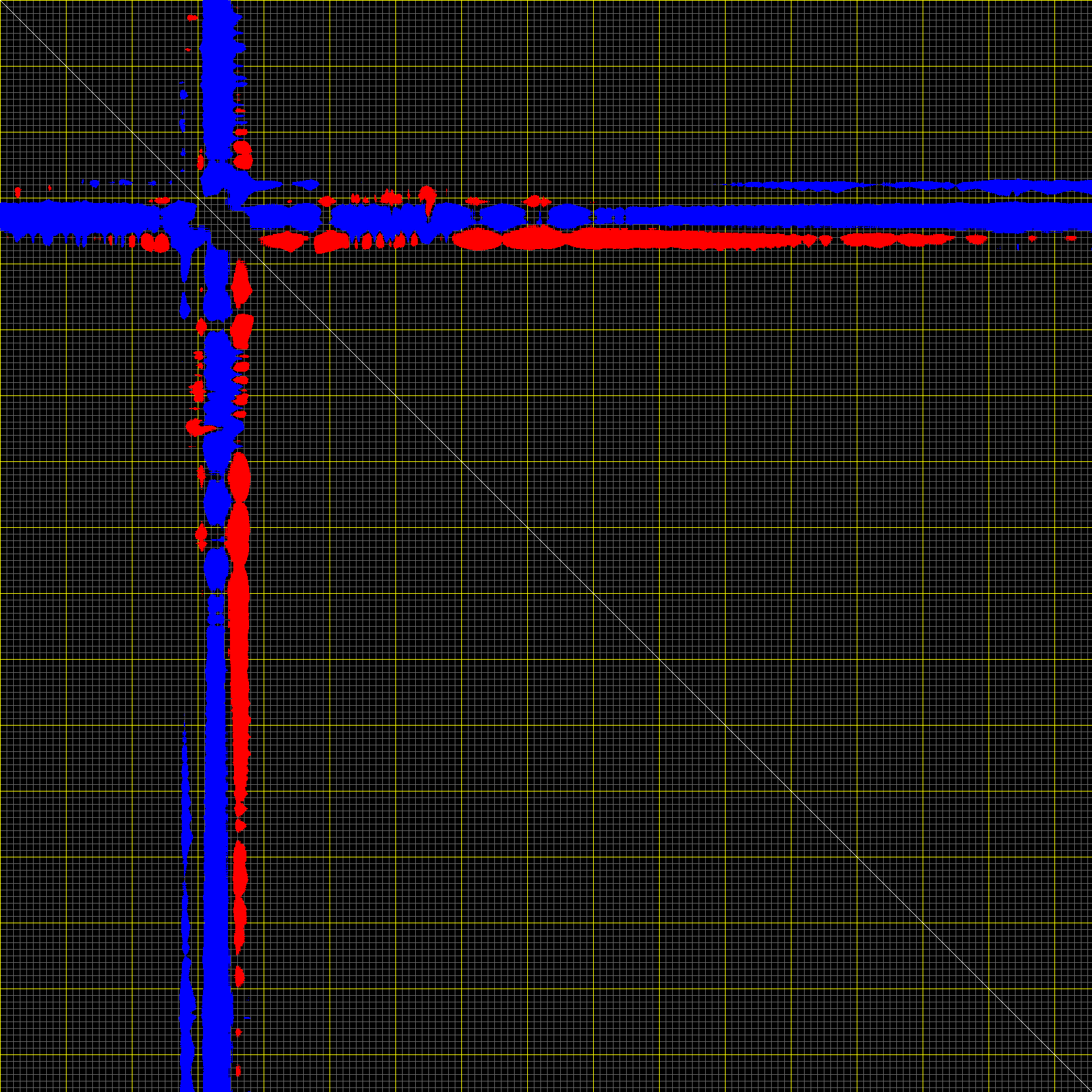 This matrix displays the maximum distance fluctuations between all pairs of CA atoms and between the two extreme conformations that were computed for this mode (DQMIN/DQMAX). Distance increases are plotted in blue and decreases in red for the strongest 10% of the residue pair distance changes. Every pixel corresponds to a single residue. Grey lines are drawn every 10 residues, yellow lines every 100 residues (counting from the upper left corner).