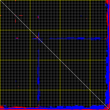 This matrix displays the maximum distance fluctuations between all pairs of CA atoms and between the two extreme conformations that were computed for this mode (DQMIN/DQMAX). Distance increases are plotted in blue and decreases in red for the strongest 10% of the residue pair distance changes. Every pixel corresponds to a single residue. Grey lines are drawn every 10 residues, yellow lines every 100 residues (counting from the upper left corner).