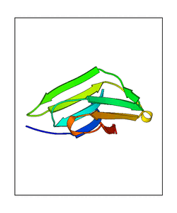 These views are prepared from three orthologuous viewpoints with MolScript. Secondary structures are determined from the C-alpha atom positions of your protein (N-terminal blue, C-terminal red).