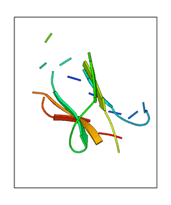 CAUTION: The amplitude range presented in these views corresponds to the highest (DQMAX) and lowest (DQMIN) perturbations chosen for this mode. Secondary structures can break down (and thus disappear from the animation) if the applied amplitudes are too large for Molscript to identify them. The choice of the amplitude is not a NMA result, but has to be done by the user on physical grounds. To change the amplitude range, you can recompute the animation of the desired mode by using the "Compute additional perturbed models with elNémo" section on the results page of your job.