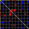 This matrix displays the maximum distance fluctuations between all pairs of CA atoms and between the two extreme conformations that were computed for this mode (DQMIN/DQMAX). Distance increases are plotted in blue and decreases in red for the strongest 10% of the residue pair distance changes. Every pixel corresponds to a single residue. Grey lines are drawn every 10 residues, yellow lines every 100 residues (counting from the upper left corner).