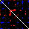 This matrix displays the maximum distance fluctuations between all pairs of CA atoms and between the two extreme conformations that were computed for this mode (DQMIN/DQMAX). Distance increases are plotted in blue and decreases in red for the strongest 10% of the residue pair distance changes. Every pixel corresponds to a single residue. Grey lines are drawn every 10 residues, yellow lines every 100 residues (counting from the upper left corner).