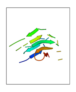 CAUTION: The amplitude range presented in these views corresponds to the highest (DQMAX) and lowest (DQMIN) perturbations chosen for this mode. Secondary structures can break down (and thus disappear from the animation) if the applied amplitudes are too large for Molscript to identify them. The choice of the amplitude is not a NMA result, but has to be done by the user on physical grounds. To change the amplitude range, you can recompute the animation of the desired mode by using the "Compute additional perturbed models with elNémo" section on the results page of your job.