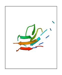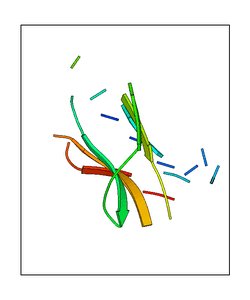 CAUTION: The amplitude range presented in these views corresponds to the highest (DQMAX) and lowest (DQMIN) perturbations chosen for this mode. Secondary structures can break down (and thus disappear from the animation) if the applied amplitudes are too large for Molscript to identify them. The choice of the amplitude is not a NMA result, but has to be done by the user on physical grounds. To change the amplitude range, you can recompute the animation of the desired mode by using the "Compute additional perturbed models with elNémo" section on the results page of your job.