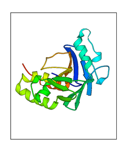 These views are prepared from three orthologuous viewpoints with MolScript. Secondary structures are determined from the C-alpha atom positions of your protein (N-terminal blue, C-terminal red).