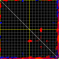 This matrix displays the maximum distance fluctuations between all pairs of CA atoms and between the two extreme conformations that were computed for this mode (DQMIN/DQMAX). Distance increases are plotted in blue and decreases in red for the strongest 10% of the residue pair distance changes. Every pixel corresponds to a single residue. Grey lines are drawn every 10 residues, yellow lines every 100 residues (counting from the upper left corner).