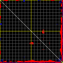 This matrix displays the maximum distance fluctuations between all pairs of CA atoms and between the two extreme conformations that were computed for this mode (DQMIN/DQMAX). Distance increases are plotted in blue and decreases in red for the strongest 10% of the residue pair distance changes. Every pixel corresponds to a single residue. Grey lines are drawn every 10 residues, yellow lines every 100 residues (counting from the upper left corner).