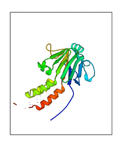 These views are prepared from three orthologuous viewpoints with MolScript. Secondary structures are determined from the C-alpha atom positions of your protein (N-terminal blue, C-terminal red).
