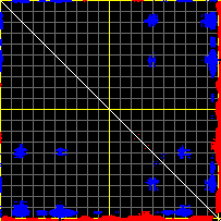This matrix displays the maximum distance fluctuations between all pairs of CA atoms and between the two extreme conformations that were computed for this mode (DQMIN/DQMAX). Distance increases are plotted in blue and decreases in red for the strongest 10% of the residue pair distance changes. Every pixel corresponds to a single residue. Grey lines are drawn every 10 residues, yellow lines every 100 residues (counting from the upper left corner).