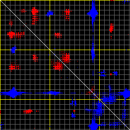 This matrix displays the maximum distance fluctuations between all pairs of CA atoms and between the two extreme conformations that were computed for this mode (DQMIN/DQMAX). Distance increases are plotted in blue and decreases in red for the strongest 10% of the residue pair distance changes. Every pixel corresponds to a single residue. Grey lines are drawn every 10 residues, yellow lines every 100 residues (counting from the upper left corner).