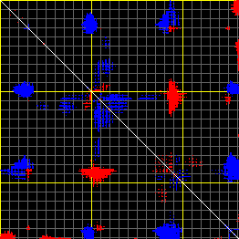 This matrix displays the maximum distance fluctuations between all pairs of CA atoms and between the two extreme conformations that were computed for this mode (DQMIN/DQMAX). Distance increases are plotted in blue and decreases in red for the strongest 10% of the residue pair distance changes. Every pixel corresponds to a single residue. Grey lines are drawn every 10 residues, yellow lines every 100 residues (counting from the upper left corner).