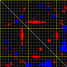 This matrix displays the maximum distance fluctuations between all pairs of CA atoms and between the two extreme conformations that were computed for this mode (DQMIN/DQMAX). Distance increases are plotted in blue and decreases in red for the strongest 10% of the residue pair distance changes. Every pixel corresponds to a single residue. Grey lines are drawn every 10 residues, yellow lines every 100 residues (counting from the upper left corner).
