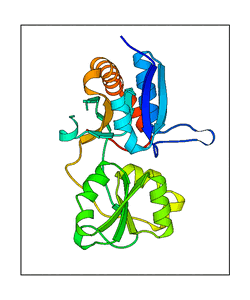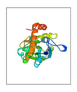 These views are prepared from three orthologuous viewpoints with MolScript. Secondary structures are determined from the C-alpha atom positions of your protein (N-terminal blue, C-terminal red).