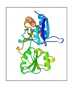 These views are prepared from three orthologuous viewpoints with MolScript. Secondary structures are determined from the C-alpha atom positions of your protein (N-terminal blue, C-terminal red).