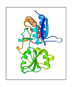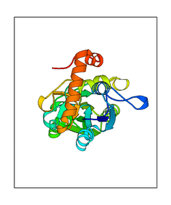 These views are prepared from three orthologuous viewpoints with MolScript. Secondary structures are determined from the C-alpha atom positions of your protein (N-terminal blue, C-terminal red).