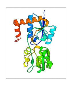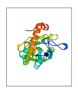 These views are prepared from three orthologuous viewpoints with MolScript. Secondary structures are determined from the C-alpha atom positions of your protein (N-terminal blue, C-terminal red).