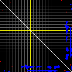 This matrix displays the maximum distance fluctuations between all pairs of CA atoms and between the two extreme conformations that were computed for this mode (DQMIN/DQMAX). Distance increases are plotted in blue and decreases in red for the strongest 10% of the residue pair distance changes. Every pixel corresponds to a single residue. Grey lines are drawn every 10 residues, yellow lines every 100 residues (counting from the upper left corner).