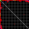 This matrix displays the maximum distance fluctuations between all pairs of CA atoms and between the two extreme conformations that were computed for this mode (DQMIN/DQMAX). Distance increases are plotted in blue and decreases in red for the strongest 10% of the residue pair distance changes. Every pixel corresponds to a single residue. Grey lines are drawn every 10 residues, yellow lines every 100 residues (counting from the upper left corner).