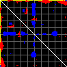 This matrix displays the maximum distance fluctuations between all pairs of CA atoms and between the two extreme conformations that were computed for this mode (DQMIN/DQMAX). Distance increases are plotted in blue and decreases in red for the strongest 10% of the residue pair distance changes. Every pixel corresponds to a single residue. Grey lines are drawn every 10 residues, yellow lines every 100 residues (counting from the upper left corner).