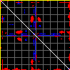 This matrix displays the maximum distance fluctuations between all pairs of CA atoms and between the two extreme conformations that were computed for this mode (DQMIN/DQMAX). Distance increases are plotted in blue and decreases in red for the strongest 10% of the residue pair distance changes. Every pixel corresponds to a single residue. Grey lines are drawn every 10 residues, yellow lines every 100 residues (counting from the upper left corner).