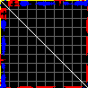 This matrix displays the maximum distance fluctuations between all pairs of CA atoms and between the two extreme conformations that were computed for this mode (DQMIN/DQMAX). Distance increases are plotted in blue and decreases in red for the strongest 10% of the residue pair distance changes. Every pixel corresponds to a single residue. Grey lines are drawn every 10 residues, yellow lines every 100 residues (counting from the upper left corner).