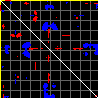 This matrix displays the maximum distance fluctuations between all pairs of CA atoms and between the two extreme conformations that were computed for this mode (DQMIN/DQMAX). Distance increases are plotted in blue and decreases in red for the strongest 10% of the residue pair distance changes. Every pixel corresponds to a single residue. Grey lines are drawn every 10 residues, yellow lines every 100 residues (counting from the upper left corner).