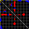 This matrix displays the maximum distance fluctuations between all pairs of CA atoms and between the two extreme conformations that were computed for this mode (DQMIN/DQMAX). Distance increases are plotted in blue and decreases in red for the strongest 10% of the residue pair distance changes. Every pixel corresponds to a single residue. Grey lines are drawn every 10 residues, yellow lines every 100 residues (counting from the upper left corner).