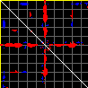 This matrix displays the maximum distance fluctuations between all pairs of CA atoms and between the two extreme conformations that were computed for this mode (DQMIN/DQMAX). Distance increases are plotted in blue and decreases in red for the strongest 10% of the residue pair distance changes. Every pixel corresponds to a single residue. Grey lines are drawn every 10 residues, yellow lines every 100 residues (counting from the upper left corner).
