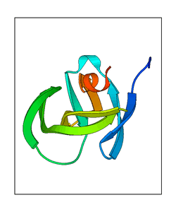 These views are prepared from three orthologuous viewpoints with MolScript. Secondary structures are determined from the C-alpha atom positions of your protein (N-terminal blue, C-terminal red).